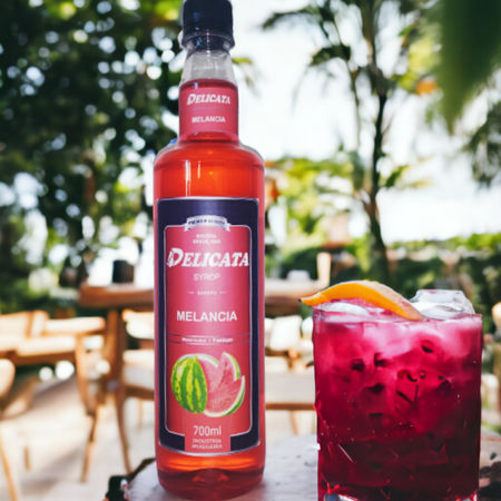 30 ml de Xarope DELICATA Melancia 2 pedaços pequenos de melancia 10 ml de licor Curaçau 40 ml de vodka